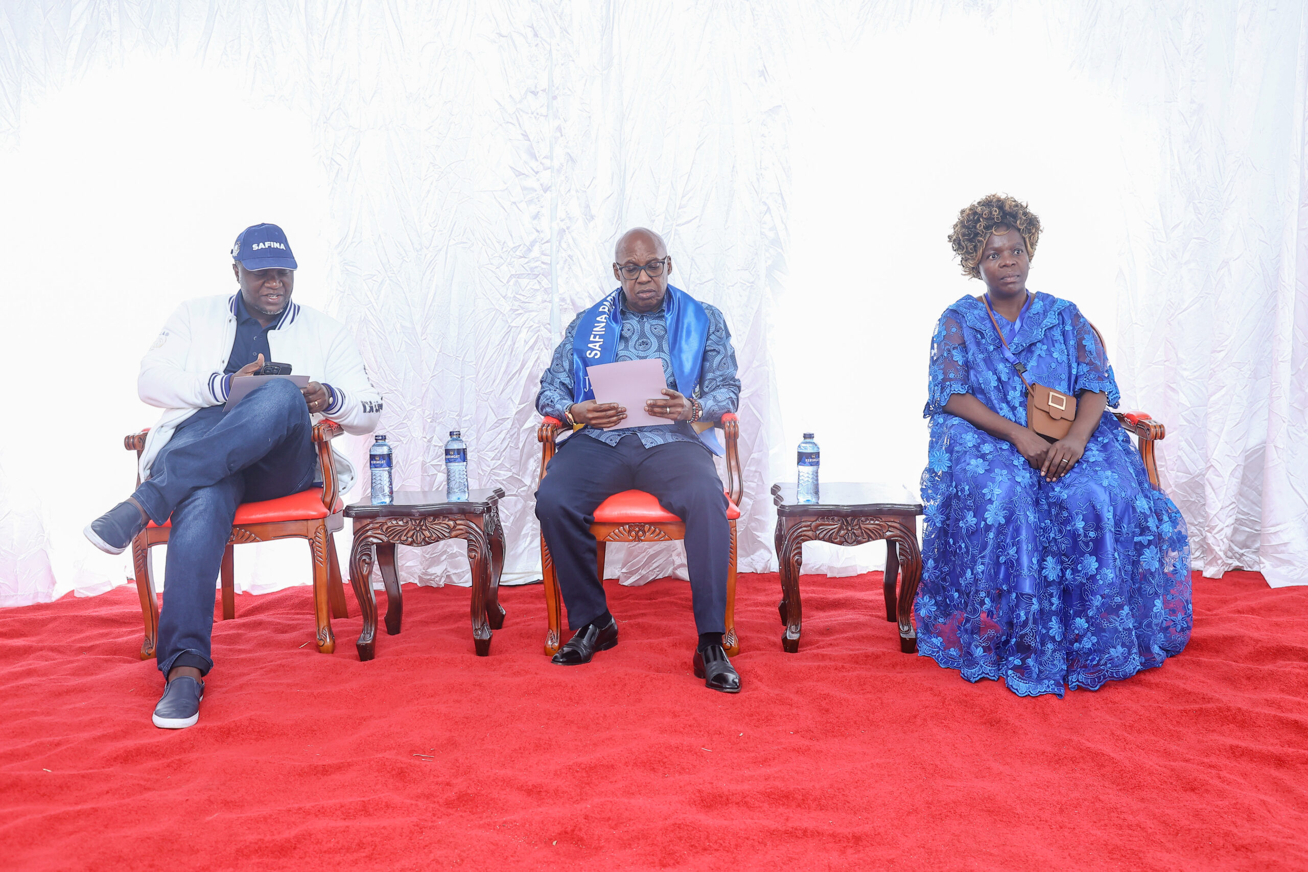 The Party colors are predominantly green, with red, black, and white as other colors. Green represents a prosperous future. Black represents the people of Kenya, while red symbolizes our past struggles to be free. White is for peace, the Party’s philosophical non violent approach to issues.The Party salute is an upright open hand representing openness and transparency.The Party’s rallying call is: “SAFINA – SAFI.